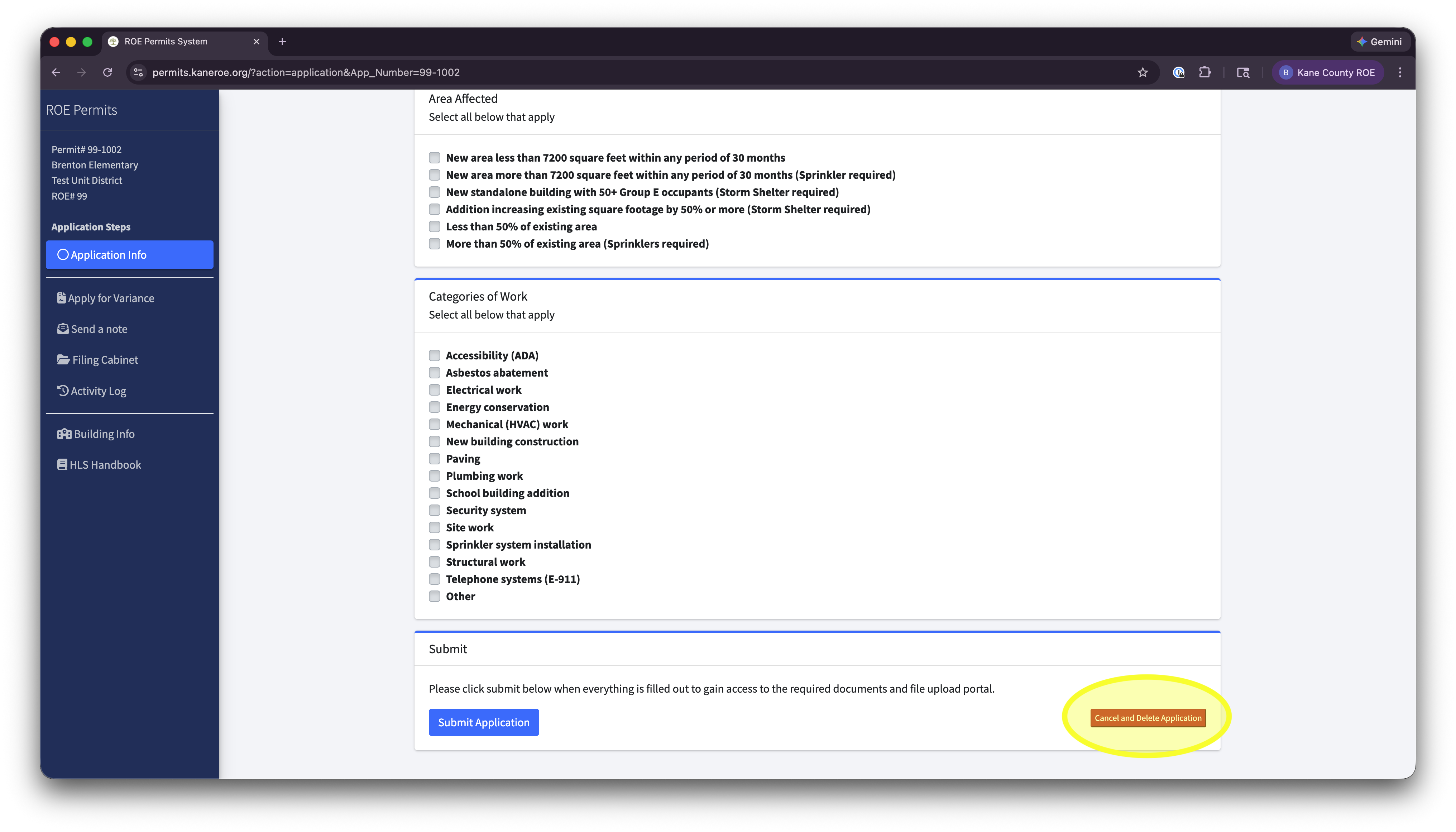 If the permit is still in the first step, with the application status of "Application Filing by District," any firm, district, or ROE user can cancel and delete the permit application by scrolling to the bottom of the Application Info page of the permit and clicking the "Cancel and Delete Application" button as seen in the following screenshot.