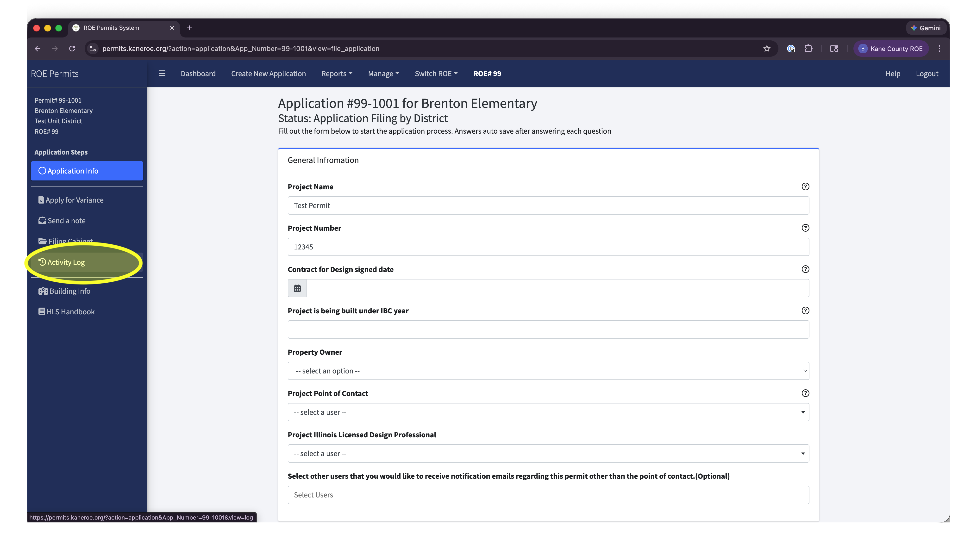 ROE Users will need to login and select the permit in question. Once in the permit, click on the Activity Log in the left side bar of the permit.